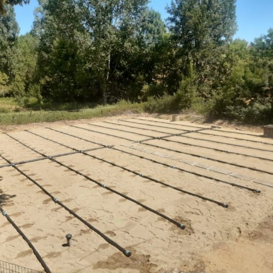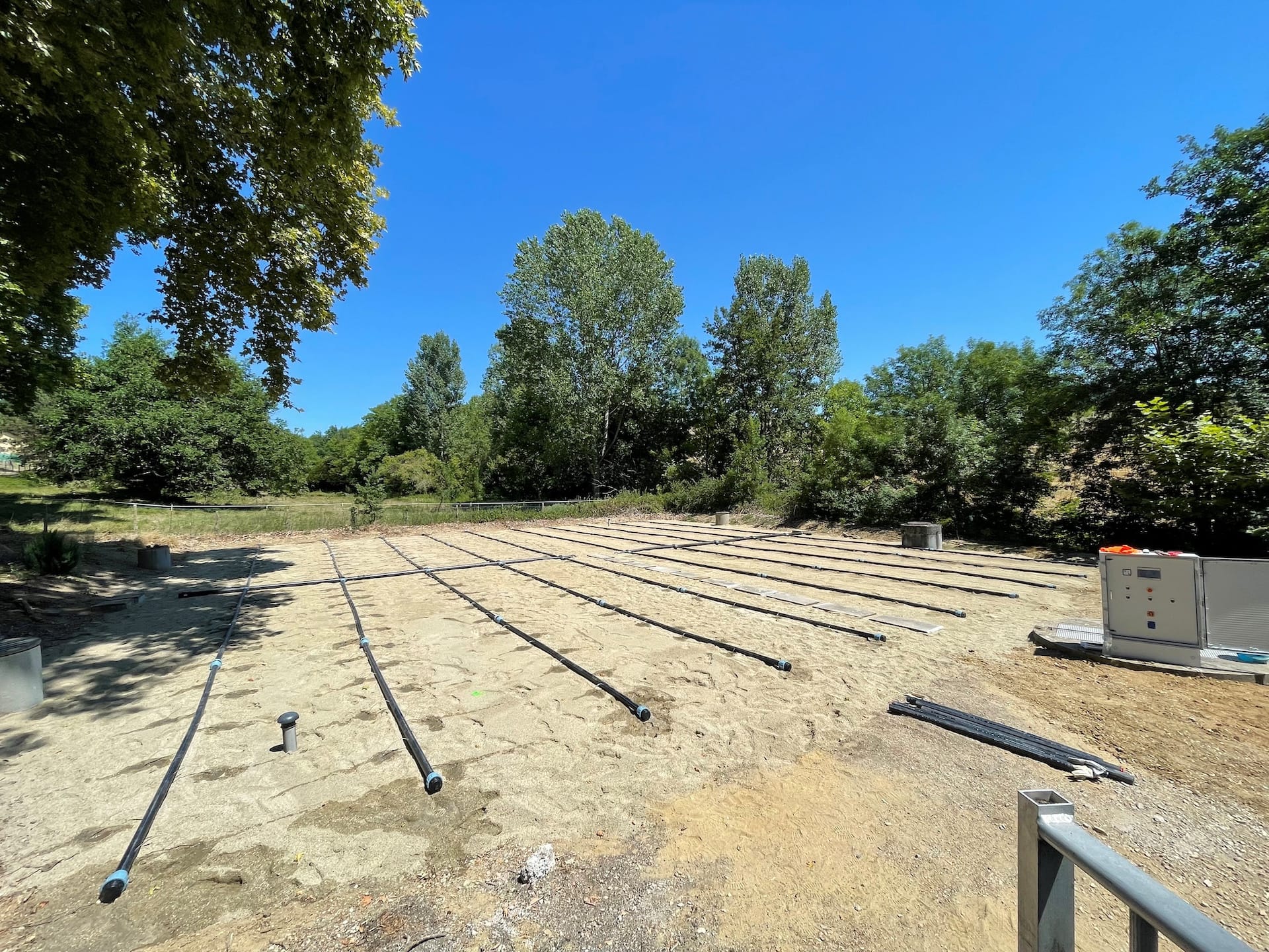 Les travaux ont inclus la fourniture et la pose d’une sonde de niveau piézométrique, ainsi que deux poires de niveau complémentaires permettant le passage en mode secours en cas de défaillance. Les anciennes canalisations et le regard de répartition ont été déposés, et une couche de sable colmaté sur 25 cm a été évacuée pour mise en stock. Un sable filtrant conforme aux préconisations techniques (DTU – granulométrie 02/04 mm) a été mis en place, garantissant une meilleure filtration et durabilité.